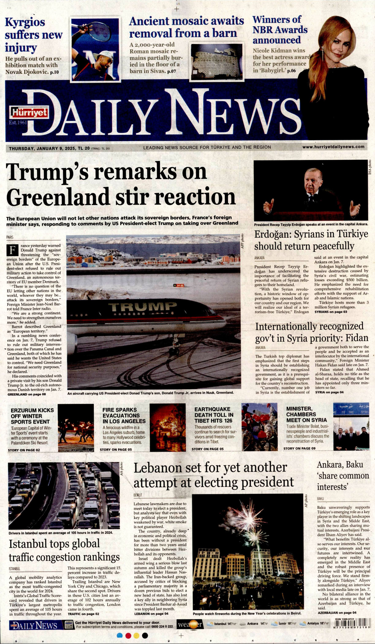 HÜRRİYET DAİLY NEWS Gazetesi 09 Ocak 2025, Perşembe Günü Manşeti
